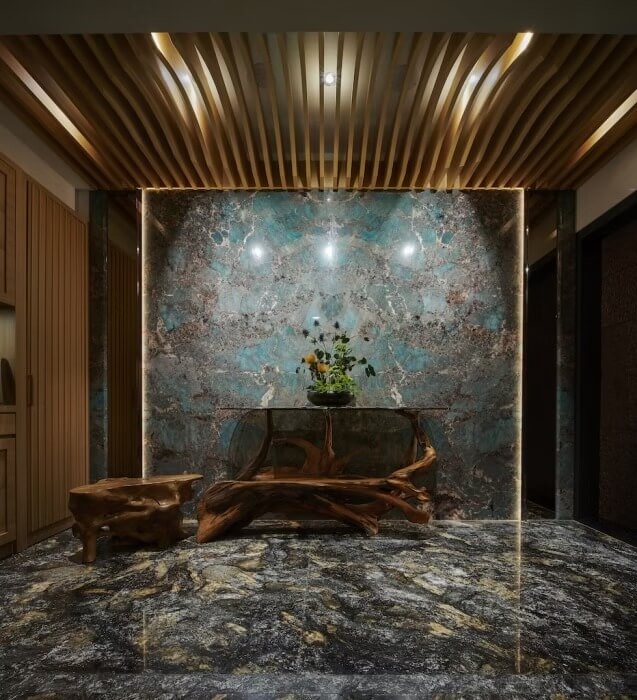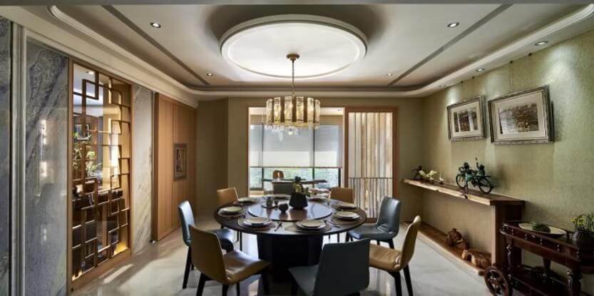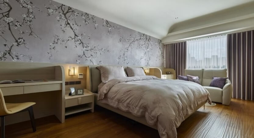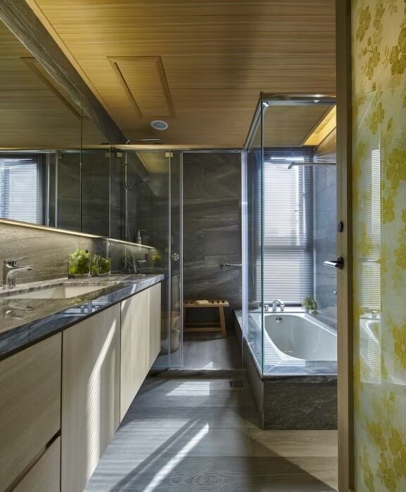然而如何讓原木帶出的茶禪輪廓與現代宮廷風格進行融合,也是本案設計的精彩之處,境庭設計向來擅長以多樣化材質堆疊出居所的華麗浪漫,此次同樣以多種材料與實木搭配互映,例如鑲嵌金箔的窯燒玻璃、實木門框與壓花玻璃的結合、珠光與花卉圖騰的壁紙使用,在大理石挑選上,也以寶石結晶多的種類為主,利用材料的豐富圖樣襯托實木的古樸。