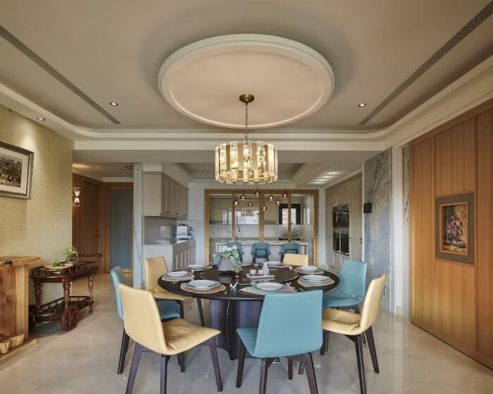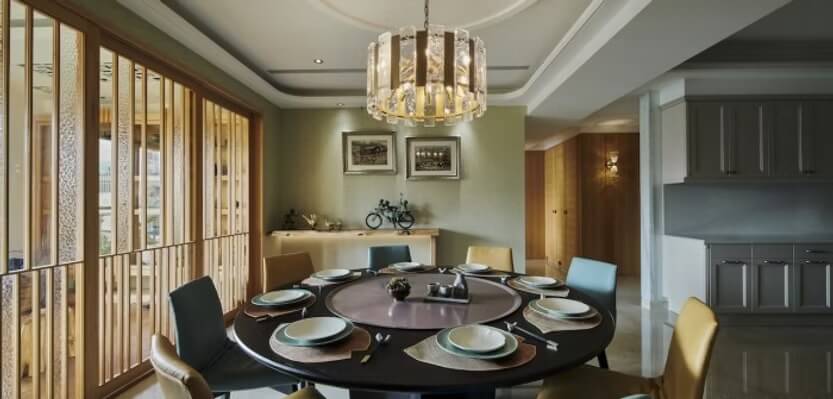 周靖雅總監也特別提到,實木比例高的空間需格外注重穿透感,除了鏡面反射也大量使用玻璃門片、鏤空的展示櫃及玄關隔屏,讓實木派上用場也兼具空間的寬敞。燈具搭配也採用晶亮穿透的材質,以天然水晶結合金屬或是玻璃的燈具在居家各處溢散浪漫。