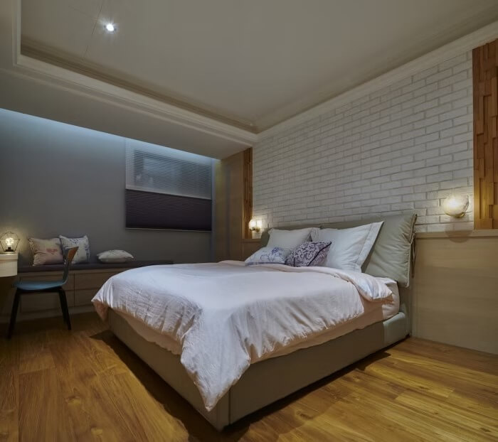 並且以全齡化住宅為核心,設計不只看現在,更是著重未來可能發生的使用情境,全室地板使用柚木實木,相對大理石與磁磚地面都來得溫潤且不易滑倒,並且導入無障礙空間設計,減少門檻與台階、玄關使用不同材質進行場域切換,空間內的門片採橫向滑推門方便單手操作,長輩房與衛浴空間的入口加大亦不做淋浴門,將需求放遠進行設計規劃。