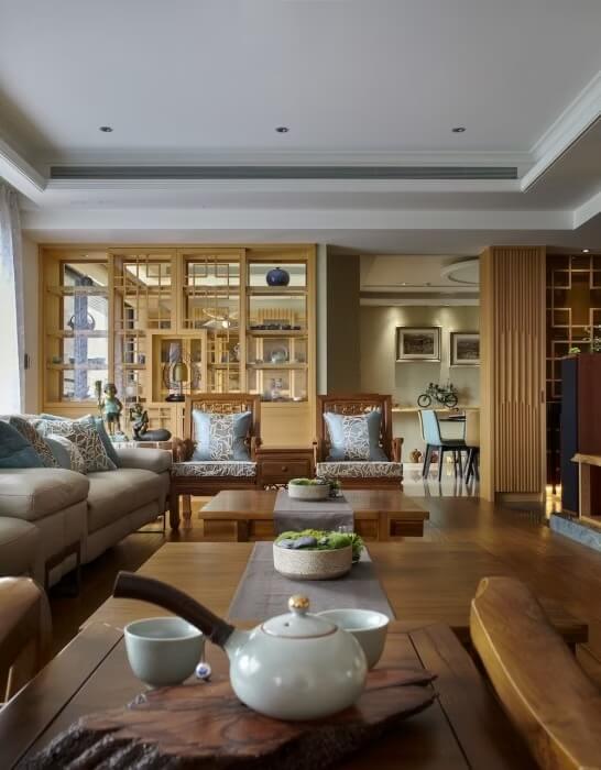 並且刻意加入不同的粉嫩色彩,柔化木質空間的古意,餐廳的藍色大理石壁面平衡了略帶鄉村的櫥櫃與實木立面的厚實、湖水綠的壁紙烘托茶室的逸趣、木製太師椅放上藍色坐靠墊並且搭配灰色皮革沙發,大幅減輕原木的厚重。