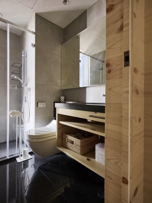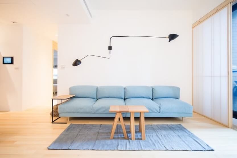 空間用色呈現無負擔的色彩美學,適應不同年世代的喜好,松木層板、門片與原木系列的家具維持色系的一致性,提供溫潤而清新的生活質感;淡藍色沙發與點綴性的黑、白燈具,訴說溫和而不軟弱的空間特質。並以障子門取代落地窗簾,在簡約清麗的設計中加入和風調味,讓傳統日本元素提煉寧靜。