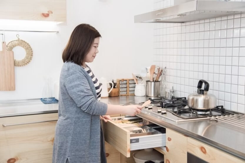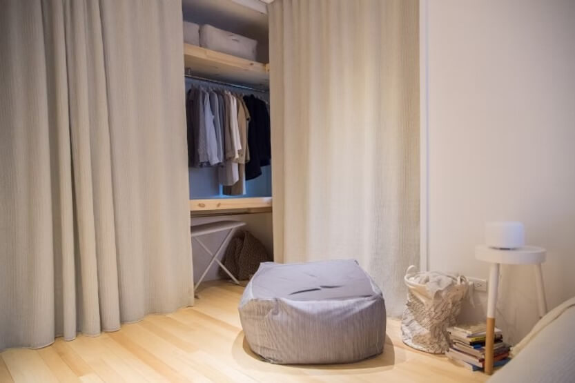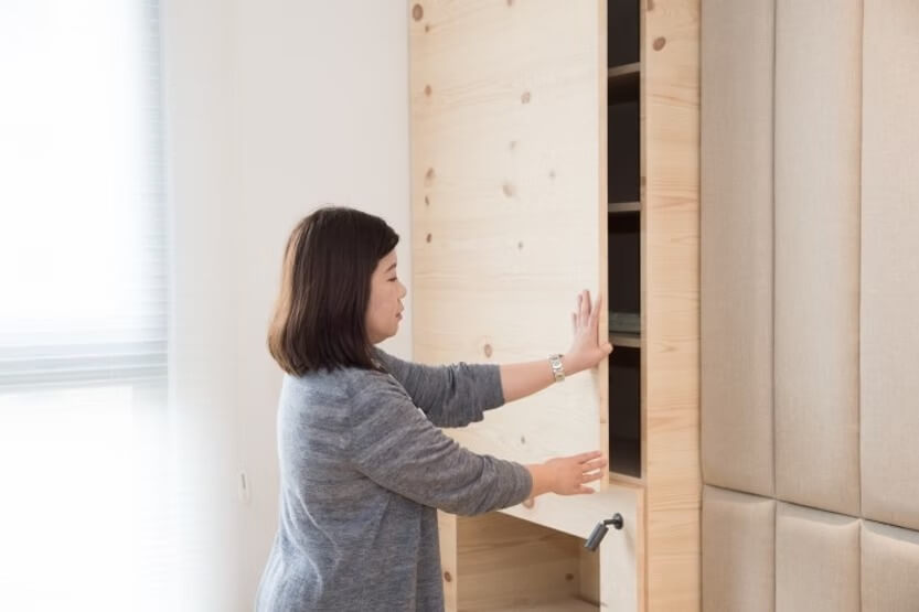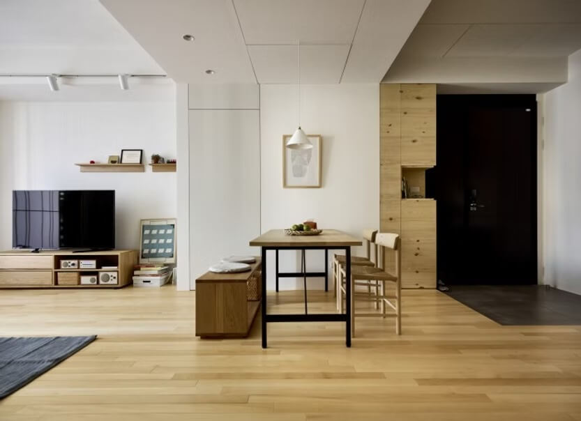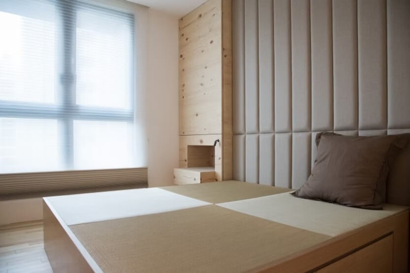 如何在細節處滿足每位成員,同時維持純淨柔和清美學的整體性,她在細節處下了許多功夫,首先,打破家的既定格局,各空間的設計傾向多樣化的使用性能,玄關旁的區域透過家具跟層板揉合多元機能,賦予不受限的使用能量;餐桌與客廳的近距離,聚會時輕鬆融為一體;走入主臥看不到床鋪,取而代之的是由四疊組成的臥鋪,引入疊蓆文化不僅讓長輩感到熟悉,也增加使用的彈性。