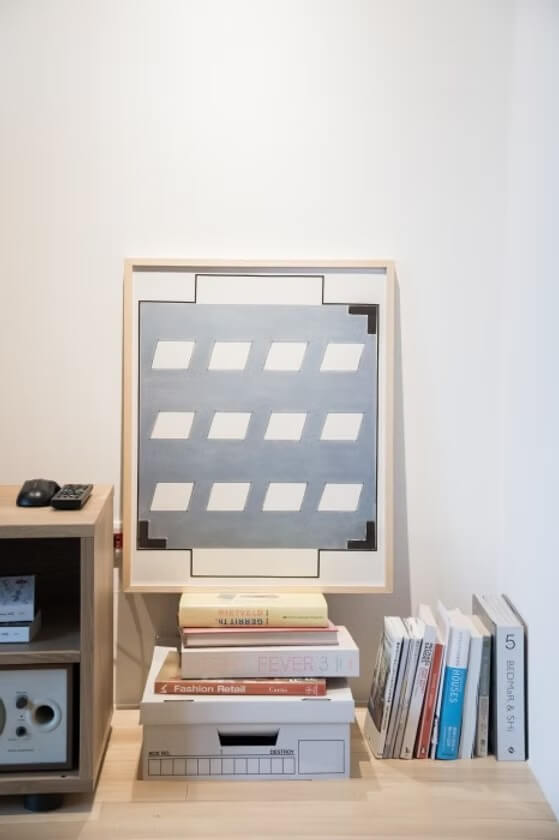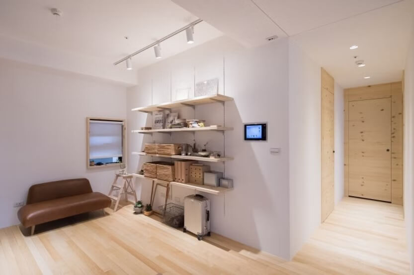 一反過去業界藉設計展現生活風格的習慣,反過來用居住者的生活美學烘托居宅風格,潘怡華表示,「直、樸、淡、麗」的美感鋪陳不是來自空間的硬體造型,而是源自於人們的真切生活。仔細觀察,此案的空間基底是白牆,沒有額外的造型背板或壁紙,內部最突顯的立面是松木房門;電視牆也不做造型設計,以一座電視櫃跟層架做為主要設計,降低設計的篇幅,才能讓生活綻放本質。