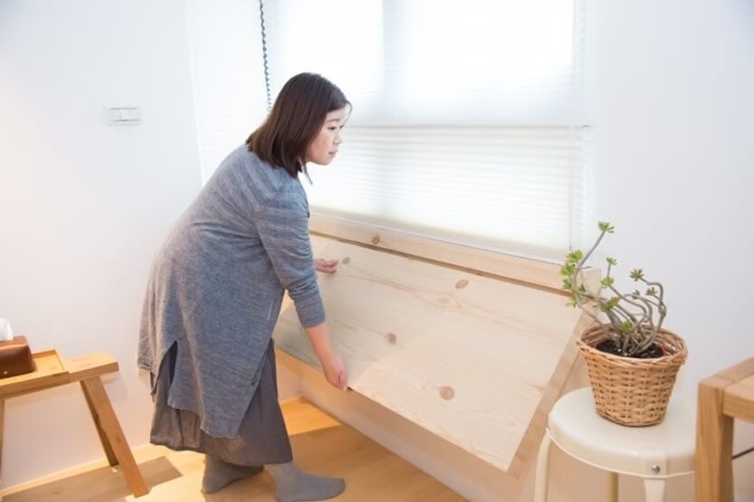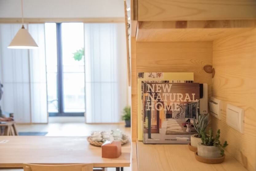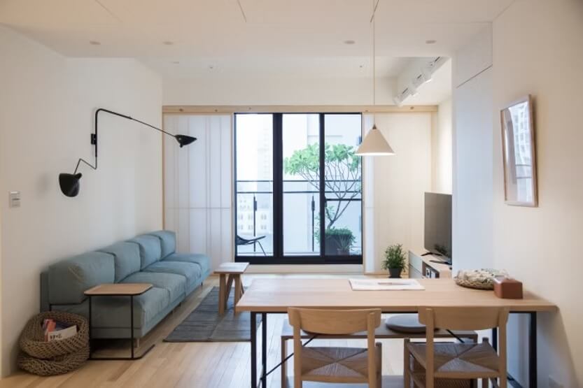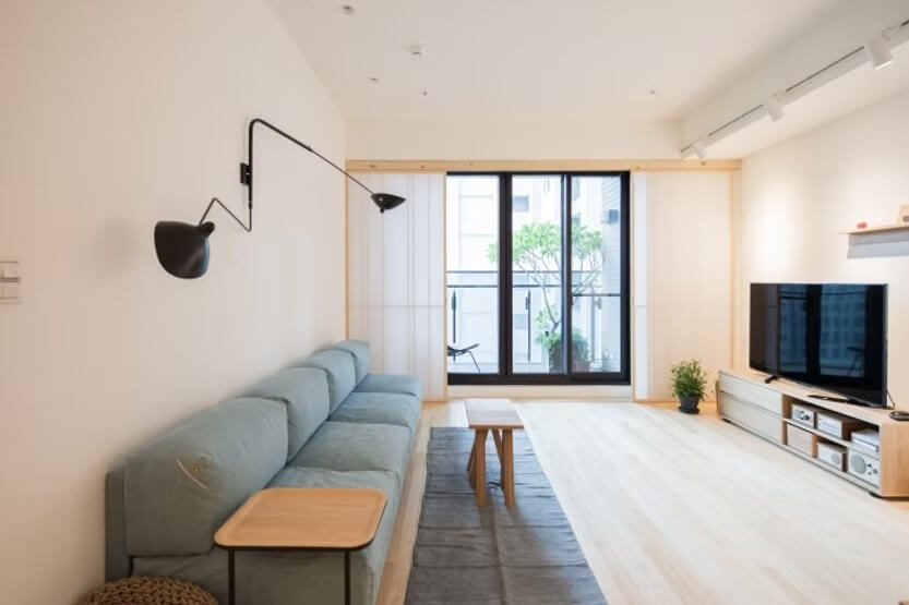 建物本身採取日式簡約的設計,以格柵構築質樸淨雅的建築立面,潘怡華在衡量建物內外的設計風格後,維持清透溫暖的設計方法,素淨的輕和風設計回應外觀的簡約輪廓,同時順應建物垂直綠化的空中院落,利用原陽台落地窗與柱子的間縫加裝障子門,日光因此變得清透柔和,障子門的細緻線條亦回應外牆木格柵的溫潤層次。
