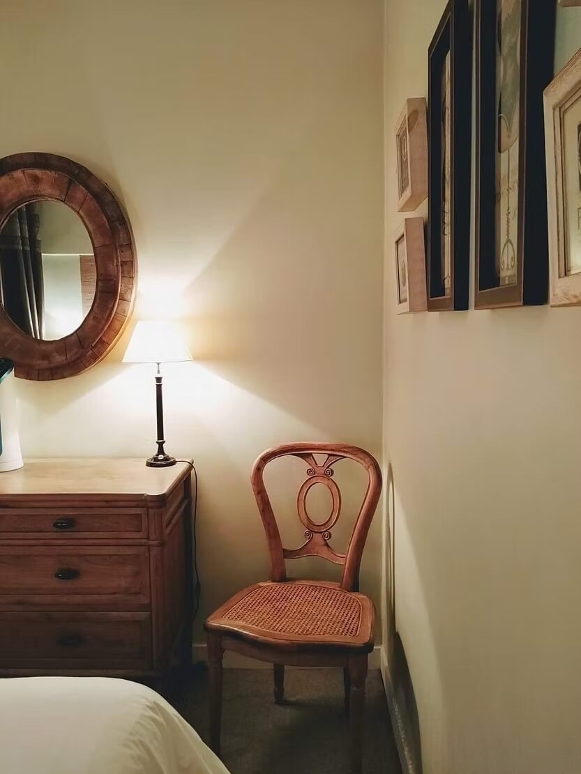 接下來,歡迎光臨我們的房間,房間不大但有一扇對外窗,床尾的牆上放了一座木頭五斗櫃,五斗櫃上一樣擺著兩盞檯燈,尺寸變迷你了,燈柱跟燈座也換成纖細的鐵件材質,補充一下,客廳檯燈的燈柱燈座都是粗粗的木頭做滾邊雕塑。櫃子跟牆的角落放一張餐椅,這個隨性DECO法也滿棒的,曲線的椅背本身就美美的啦!