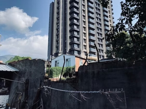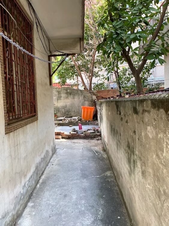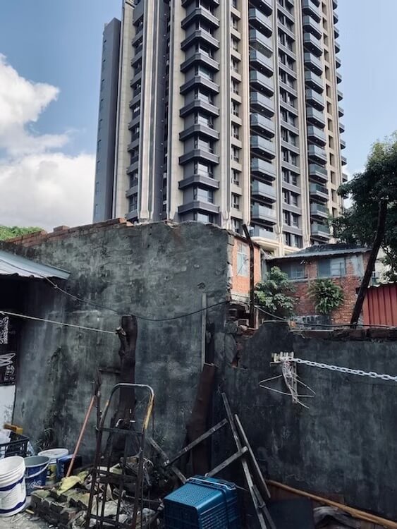 房子的圍牆破了一角,鋼筋裸露在外頭,圍牆內是一小塊空地,空地上還有一間小屋,看起來像工寮,但也許也是一間住所;圍牆外是一棟嶄新的新建案,看到這景像……我心中浮出一句成語:一線之隔,圍牆這一條線,畫出了貧富差距啊……