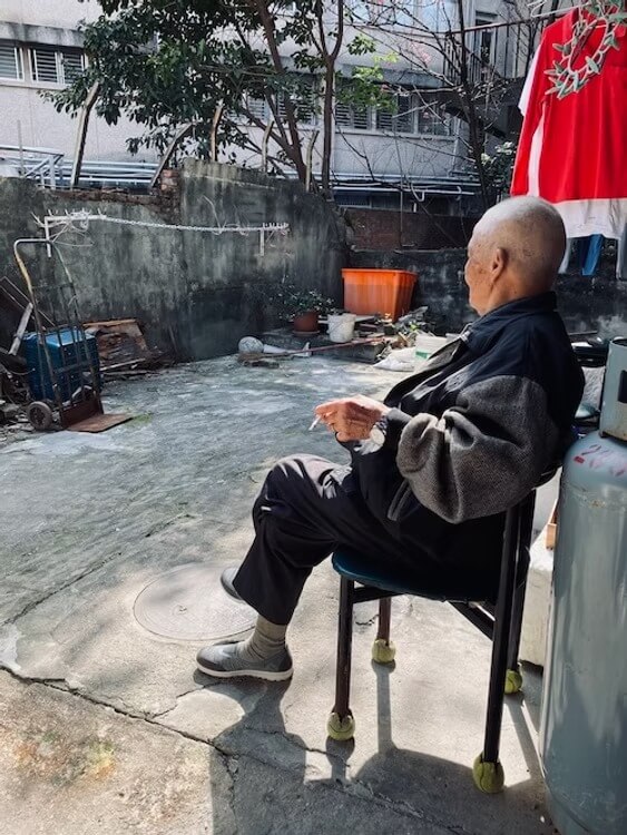 聽說這棟住的都是獨居老人啊……才剛講完,就有一位老爺爺走出來,坐在空地的椅子上,抽起菸來……