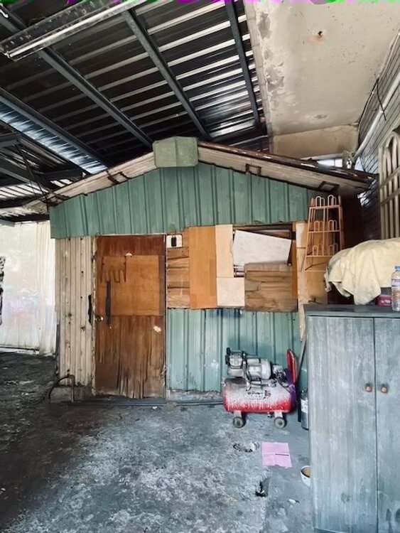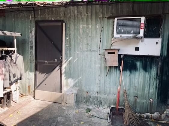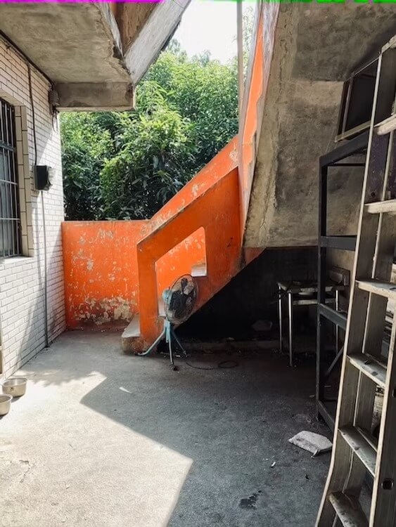 原本的建築物是一棟L型的房子,不知在何時,也不知是誰做的,在原先的內凹空地、往外長了兩間鐵皮屋,分別在L的兩個沿線端點,鐵皮屋中間還是有個角落,這個角落通往原始建築的樓梯,也算是這棟公寓的入口。