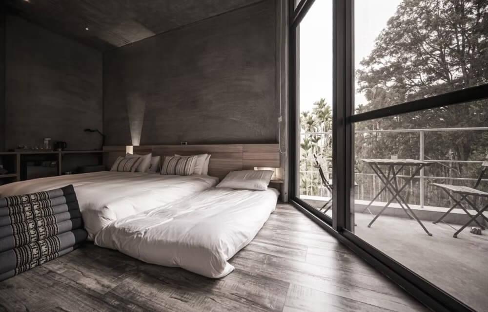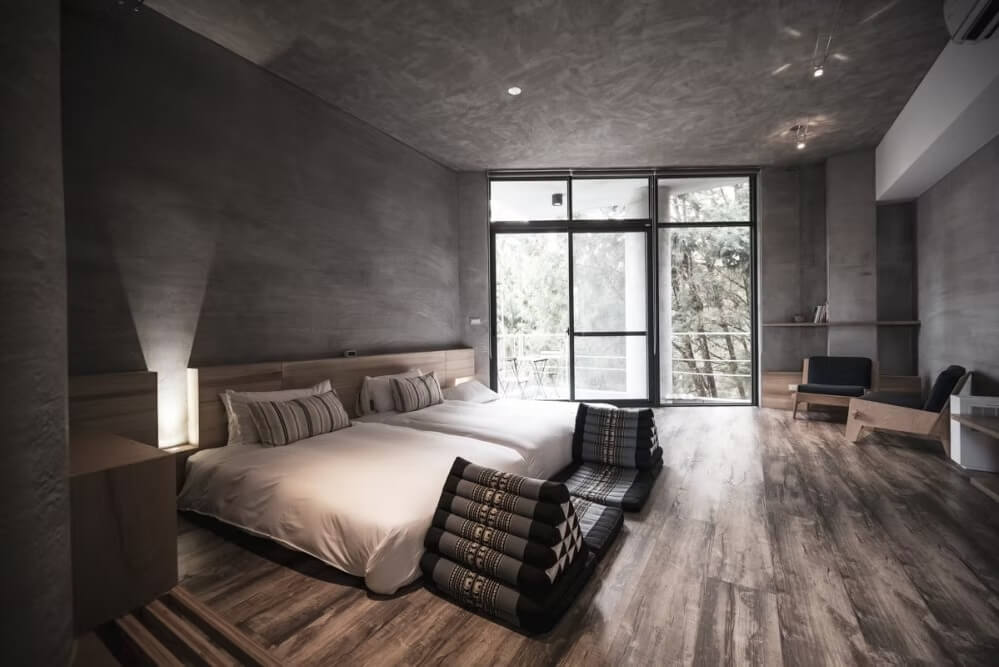 這塊地有許多老樹,百年、七十年的肖楠跟五葉松,房子對應樹的位置建蓋,讓老樹陪著房子,特地將每間房間面對不同的風景,有大露台能遠望山野、也有伸手即可觸碰樹梢的小陽台,樹影、光影互映感受日光的推移變化。每間房間都有自己獨特的地方,有大有小形狀也不一致,例如特意對比的兩間四人房Mahumhum跟Ihiasan,形狀差不多,Ihiasan有一排落地窗但Mahumhum只留了小窗,Ihiasan在邵族語是被照亮之意,像是睡太晚被太陽曬醒了,而Mahumhum則是黑暗,回應空間的靜謐。