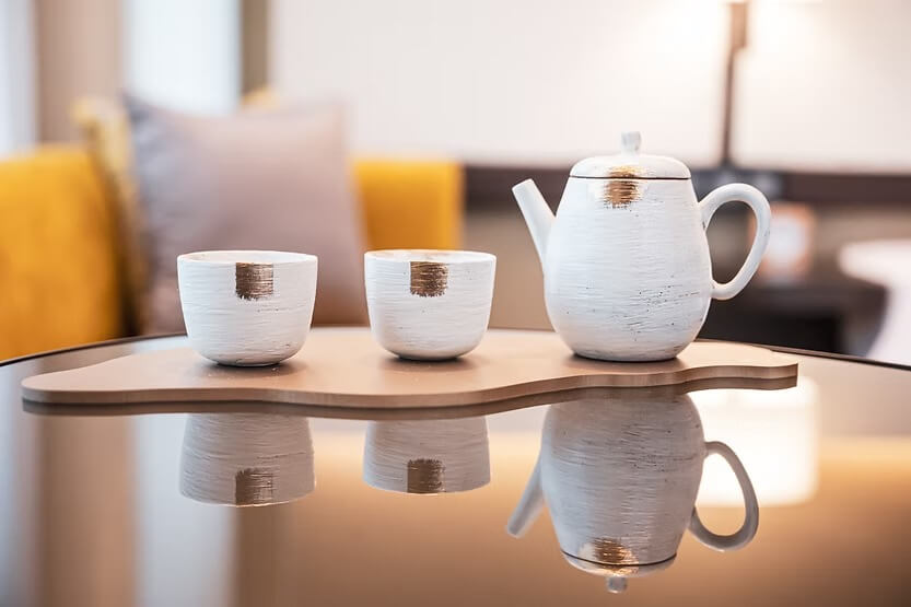 「從飯店的藝術選品到備品,以及大浴場的動線設計,都可以看見台灣團隊的用心。」周靖雅說,她尤其被齊柏林的投影畫面感動,沒想到客房內竟又放著齊柏林的馬克杯,以及來自鶯歌的茶具跟造型酷似台灣的托盤,茶包也不像日本連鎖飯店使用統一的茶包,選了台灣原創品牌京盛宇的茶,特別是代表代表台灣的茄芷袋,提供房客用作前往大浴場的提袋,這些細節,都是「和苑三井花園飯店 台北忠孝」觸碰台灣的用心。