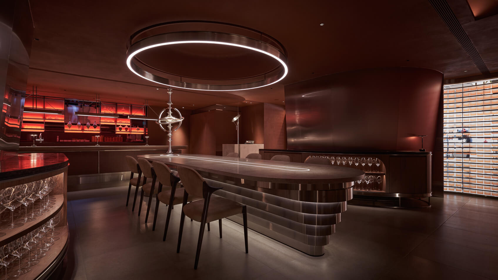 外觀以片狀壓克力錯落拼排出航艦駛過的浪花,保留通透與隱私又適度引發外界的探索奇想。不鏽鋼與鍍鈦創造航太及科幻氛圍,再隱晦置入東方元素如橘紅與圓,引人慢慢發覺空間與東方的連結。